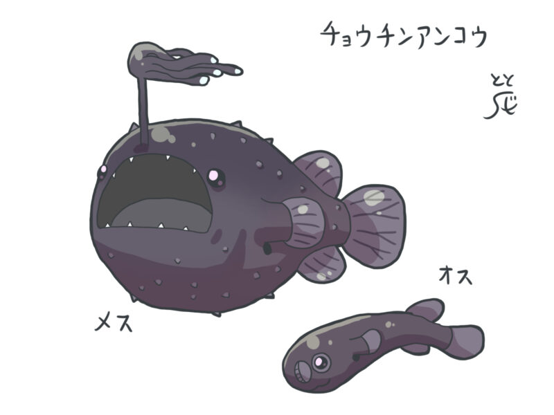 チョウチンアンコウは稚魚の頃は成魚の時よりも浅い場所で生活します。稚魚の時はオスもメスも同サイズで身体はゼリー質に覆われていて、口が発達するまではこれを栄養源にしていると考えられています。
