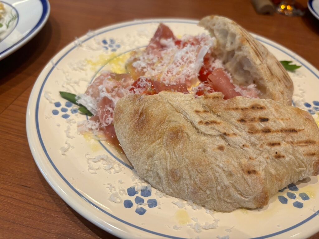 看板メニューの「プッチャ」は、南イタリアのローカルフードをアレンジした一品。香ばしい生地に生ハムやストラッチャテッラ、塩レモンなどを挟んだサンドは、食感と風味のバランスが絶妙です。ランチやテイクアウト、ワイン片手のディナーにもぴったり。