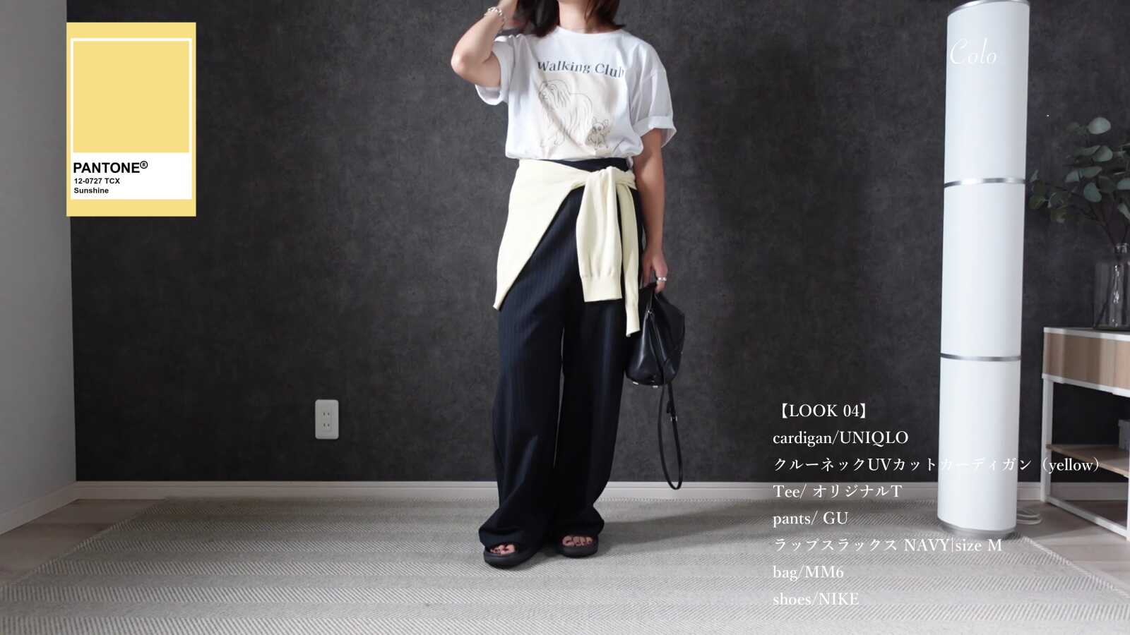 ラップスラックスがメンズライクなラフなイメージのアイテムなので、トップスのロゴTは相性抜群なのですが、それだけだとかなりカジュアル寄りになってしまう......そんな時に便利なのがカーディガンの腰巻きです!こなれ感も出ますし、腰の高い位置で結ぶことで目線が上に行き、スタイルをよく見せる効果もありますよ。