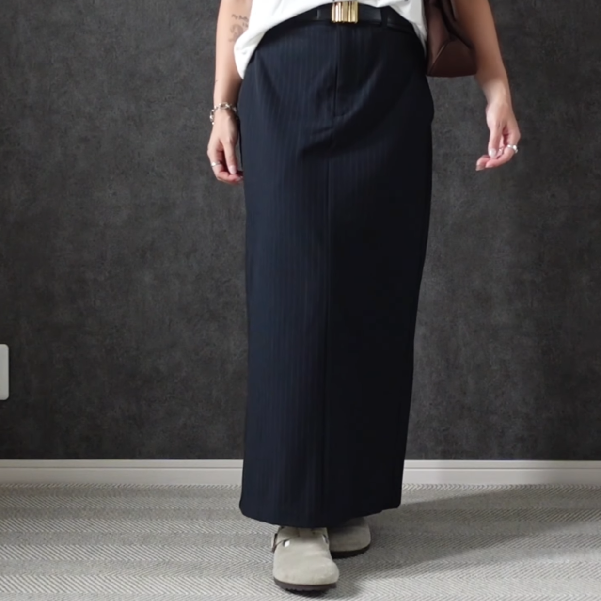 まずは、ナロースカートの着回しコーデ1つめからご紹介します。