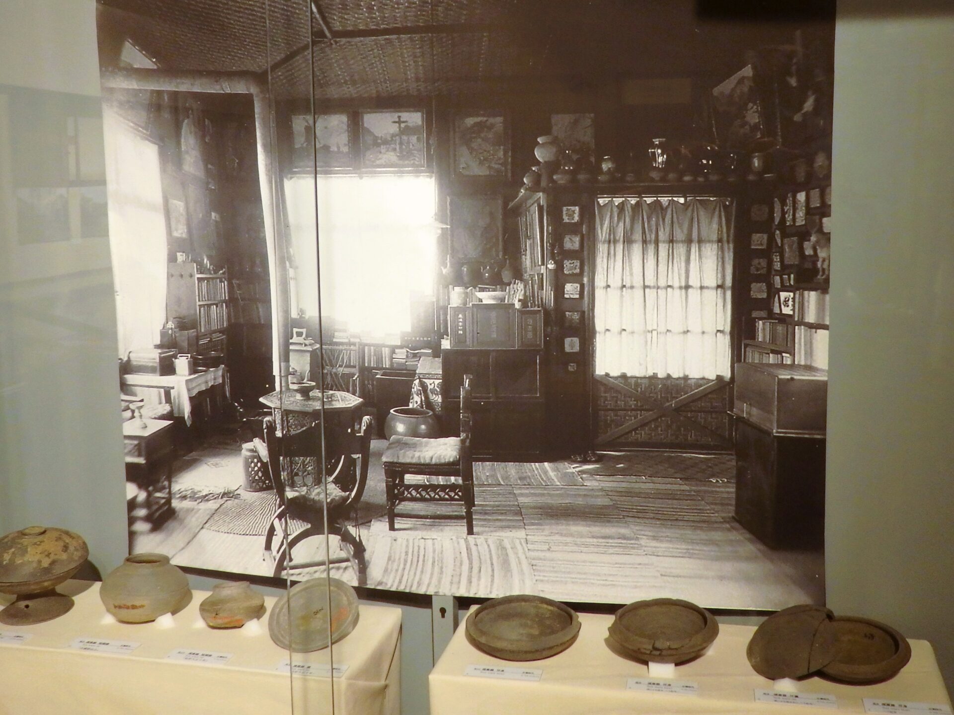 1923年にはエジプトを訪れており、考古学への関心が一過性ではなかったことがわかります。そして、写真のなかに目を凝らすと、カーテンの上に並ぶ須恵器の姿が見えるのです。