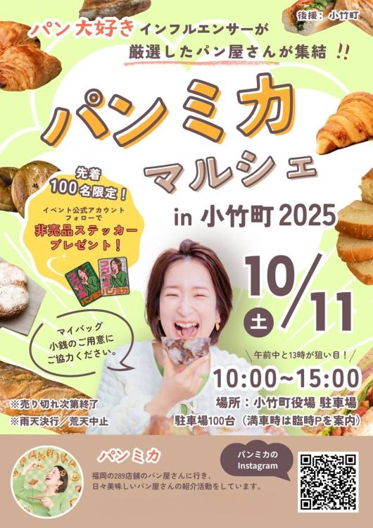 福岡にある289店舗のベーカリーを訪れ、日々おいしいパン紹介活動をしているインフルエンサー・パンミカが厳選したパン屋が小竹町役場の駐車場に集結するイベント『パンミカマルシェin小竹町2025』が2025年10月11日(土)に開催されます。