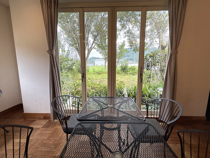 テーブルや椅子はアイアン製の細いフレームが特徴。さらに大きな窓からはお庭のグリーンが眺められます。