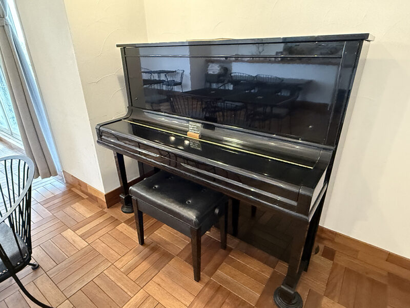 片隅に置かれた黒いアップライトピアノ。こちらはオブジェとして置かれているので、くれぐれも手を触れないようにご注意ください。