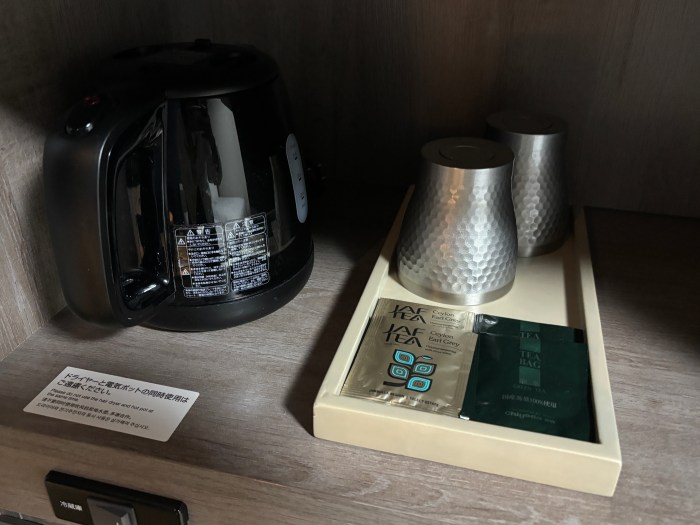 旅館とビジホの中間みたいな感じで、縁側っぽい「あのスペース」もある。地味にテレビでWOWOWが見放題なのと、お茶&紅茶のパックが置いてあった。