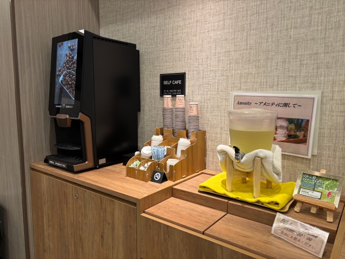 まず、エントランスが広くて開放感がある。あちこちにソファが置いてあって、ウェルカムドリンクとしてコーヒーと、マスカット味のビネガードリンクが飲み放題になっていた……!