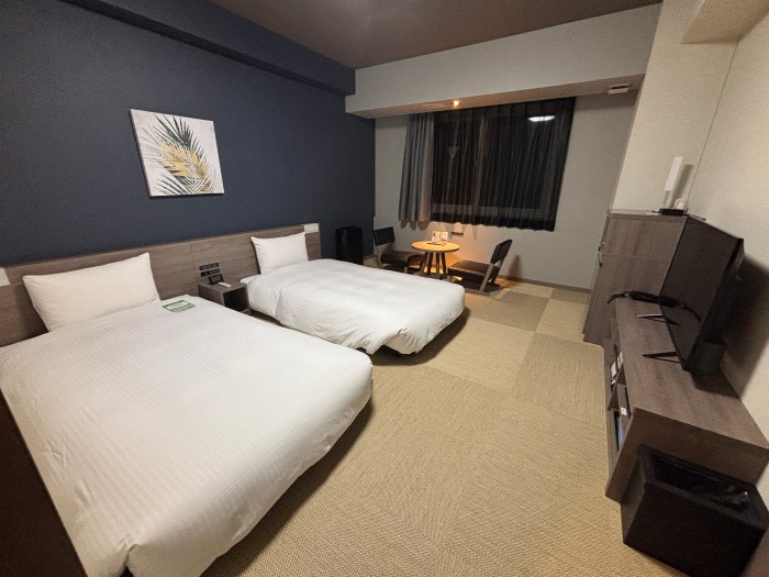 今回泊まったのはツインの部屋だったのだが、客室が畳っぽくなっていて、スリッパではなく靴下でくつろげる仕様。なかなかの広さ。