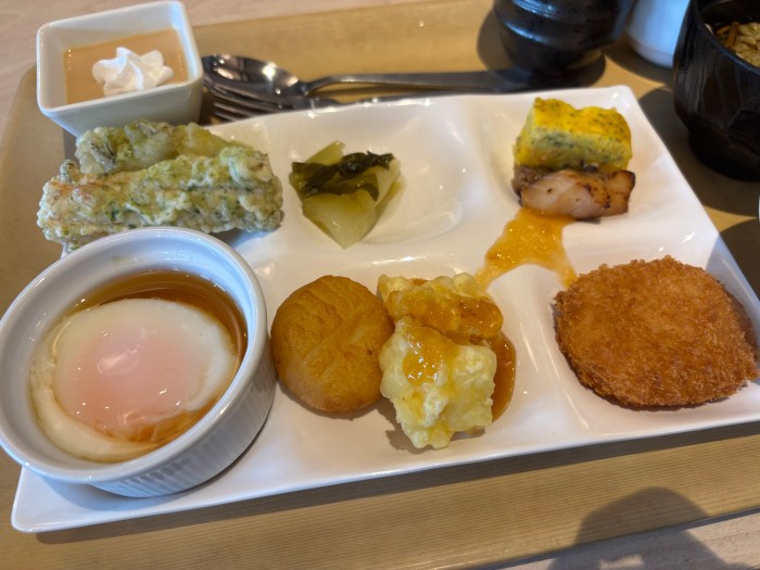 朝食バイキングも、品数はめちゃくちゃ多いってわけじゃないけど、ちゃんと秩父の名物の「わらじかつ」とか「みそポテト」とかそば、しゃくしな漬けなど、地元の食べ物が並んでいる!