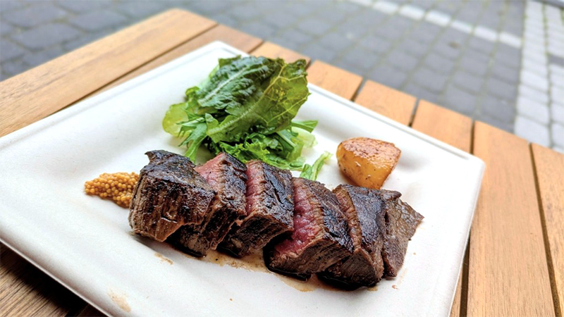 オーダー後に焼き上げられたステーキは、赤身肉らしい心地よい歯ごたえがありジューシー。さわやかな粒マスタードが絶妙なアクセントで、ビールや赤ワインとの相性良好です。木のテーブルやローチェアが並び、アウトドア感が楽しい会場内。キャンプでお肉を焼いて食べているような、開放感が味わえました。