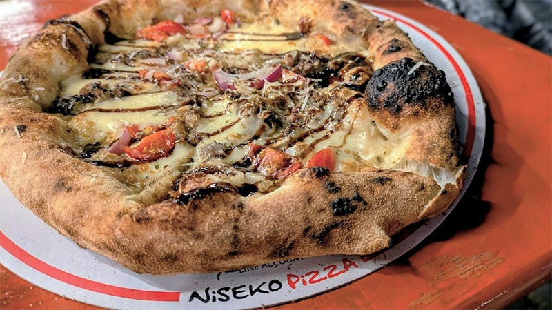 店内の窯で焼き上げられるピザを求めて毎年大行列ができる「Niseko Pizza」で、「フンギ&サルシッチャ」(3000円)をいただきました。黒松内産のモッツアレラチーズに、たっぶりのきのこ、香ばしい生地にバルサミコの風味がさわやかで、秋らしい味わい。人気&行列も納得のおいしさです。