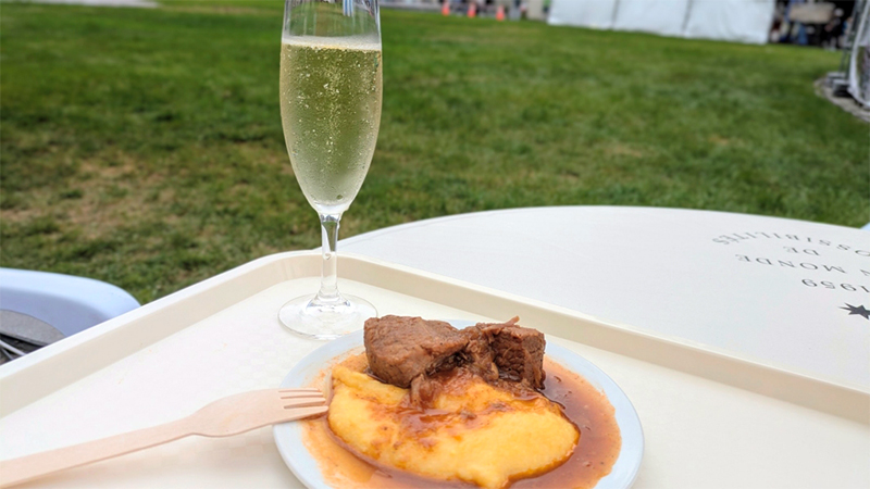 開幕の12日・13日は札幌のイタリアン「Semina(セミーナ)」田中シェフの日。「せたな 野中さんの仔牛の煮込み 栗山産ポレンタ」(1,000円)と、「スパークリングワイン」(1,100円)をいただきました。