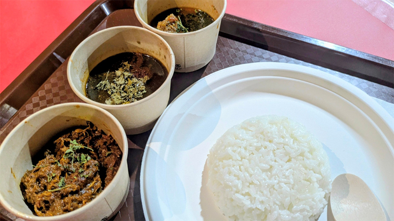 「E-itou Curry」の「北海道産もち豚角煮のジンジャーカレー」、「CURRY KITCHEN onion」の「17スパイス×濃厚玉ねぎの無水チキンカレー」「ホンジツノカレー」の「いか墨のコクと旨み サッポロブラックキーマカレー」を選択。毎日異なるカレー屋さんが出店するカリーキングダムでは、期間中に何度も別のカレーに出会えます。
