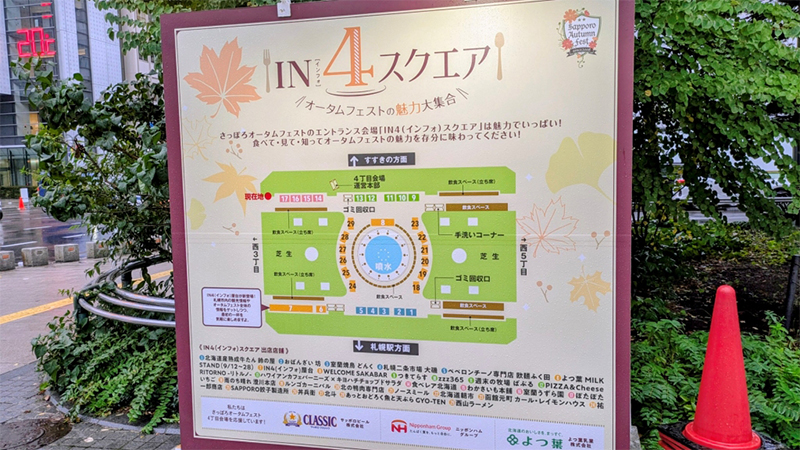 大通公園4丁目会場は、オータムフェストの玄関口である「IN4(インフォ)スクエア」。 通りがかりに思わず吸い込まれるように入ってくる人も多く、常ににぎわっている会場です。まずは軽くつまめるフードやスイーツを楽しみつつ、マップを見ながら広いオータムフェストをどう回るかを考えるのがおすすめです。