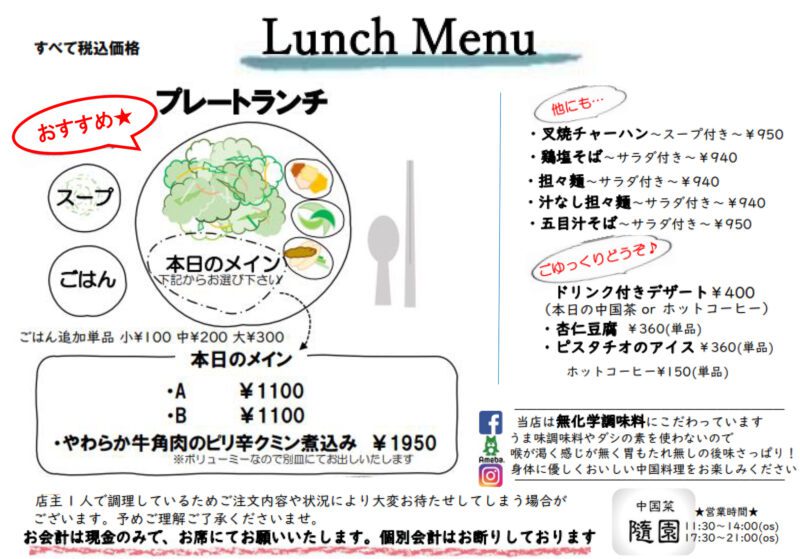 香椎宮の目の前で10年間営業していた「中国菜 隨園」だったが、入居していた建物が老朽化のため解体されるということで2021年4月に同じ東区若宮へ移転し現在に至っている。