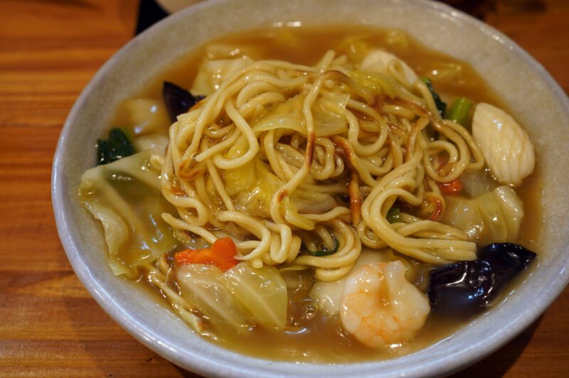 僕がおすすめの麺は、冬季期間限定の「餡かけ固焼きそば」(写真上)だ。モチモチ太麺に焦げ目を入れるくらい焼いた上にエビ、イカの海鮮系と野菜を餡でとじた熱々麺だ。寒い時にぴったり。逆に夏限定だが冷麺(写真下)も大人気。毎年冷麺が始まるのを楽しみにしている常連客も多い。