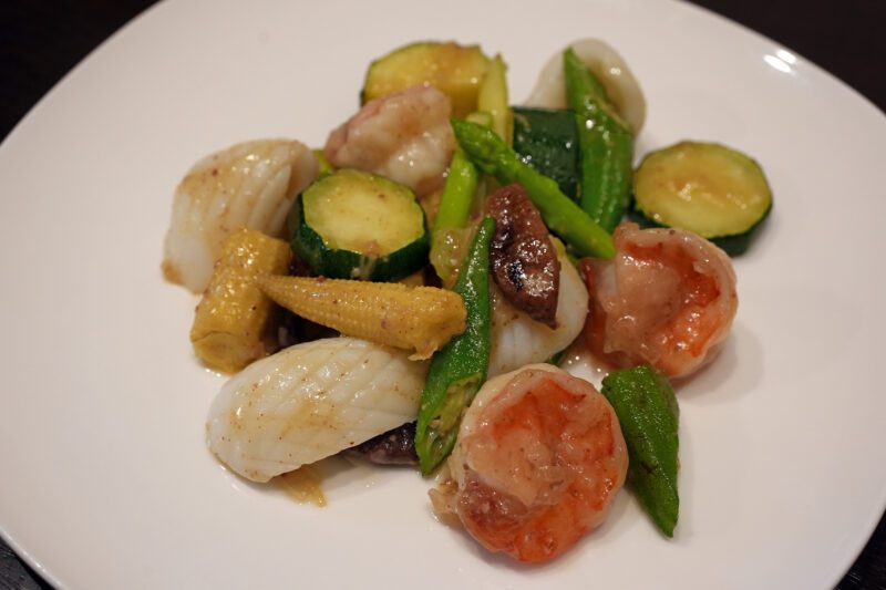 そして夜を中心に提供している単品メニュー。まず店主おすすめは、「天然エビとイカの自家製XO醤炒め」の名前が最初に上がった。自家製XO醤を無化調で作るのが手間暇かかるがオリジナルの味を楽しんで欲しいとのこと。プリップリの海老とイカ。良い塩梅の塩加減でお酒も食もすすむ。