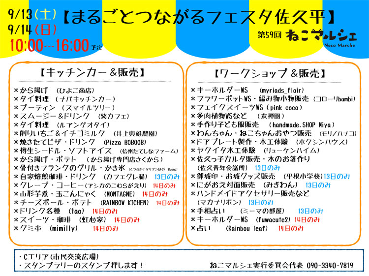 9/13(土)9/14(日)『第3回まるごとつながるフェスタ佐久平』駅・市民交流ひろば・イオンモールなどでイベント開催!『ねこマルシェ』、全国有名駅弁&鉄道グッズ販売なども!@長野県佐久市