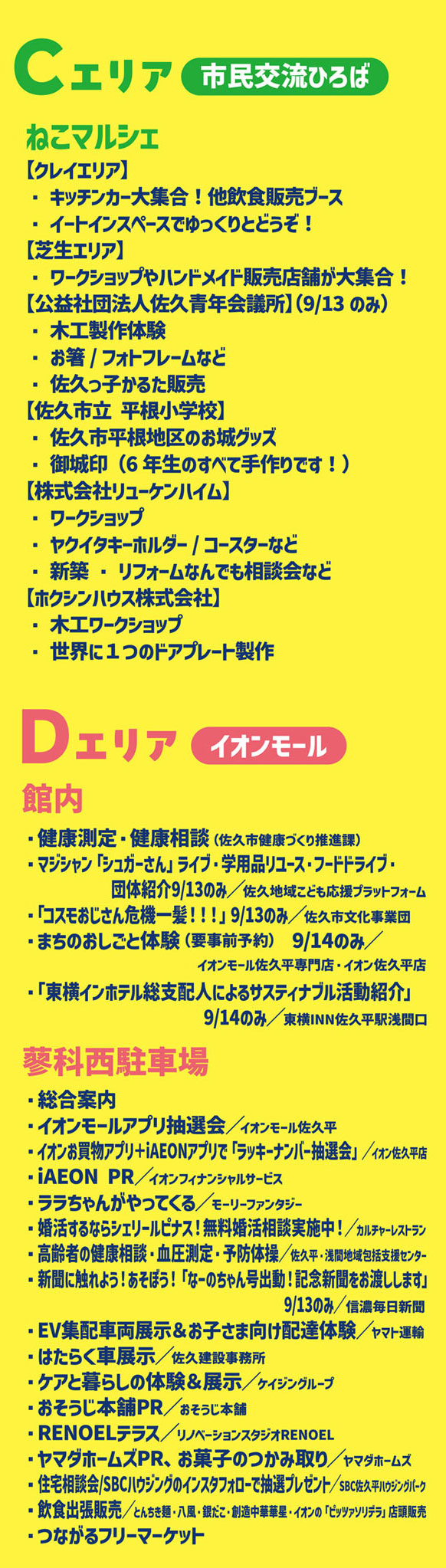 ”作る楽しさ!面白さ発見!”がテーマの「市民交流ひろば」(MAP/Cエリア)は、キッチンカーやワークショップなど約32店が並ぶ人気の『ねこマルシェ』。"駅から魅力発進”をテーマにした「佐久平駅/駅前広場」(Aエリア)では、バス関連の販売、クラフトビールイベント、全国有名駅弁販売、鉄道グッズ販売、駅長体験(事前予約)なども楽しめます。
