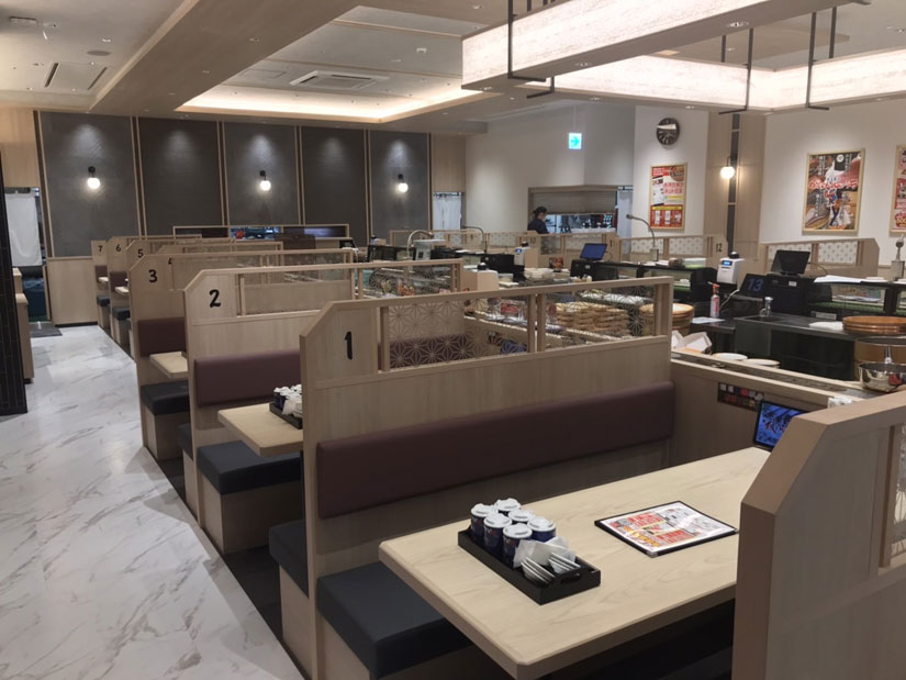 店内にはカウンター席と回転寿司らしいボックス席が並びます。