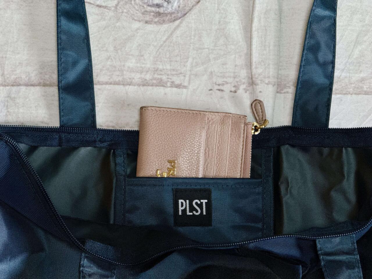 ポケットには「PLST」のブランドロゴ入りの織りタグ付きで、内側もさりげなくおしゃれな工夫が凝らされています。