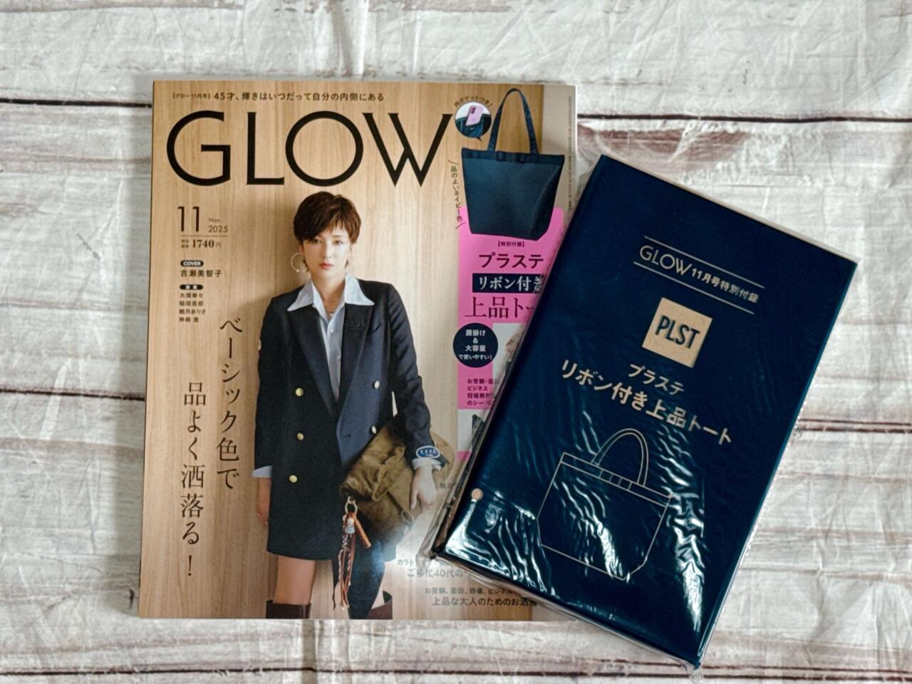 2025年9月27日(土)に発売の雑誌『GLOW(グロー)』11月号には、PLST(プラステ)の「リボン付き上品トート」が付録として付いてきます。
