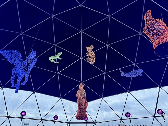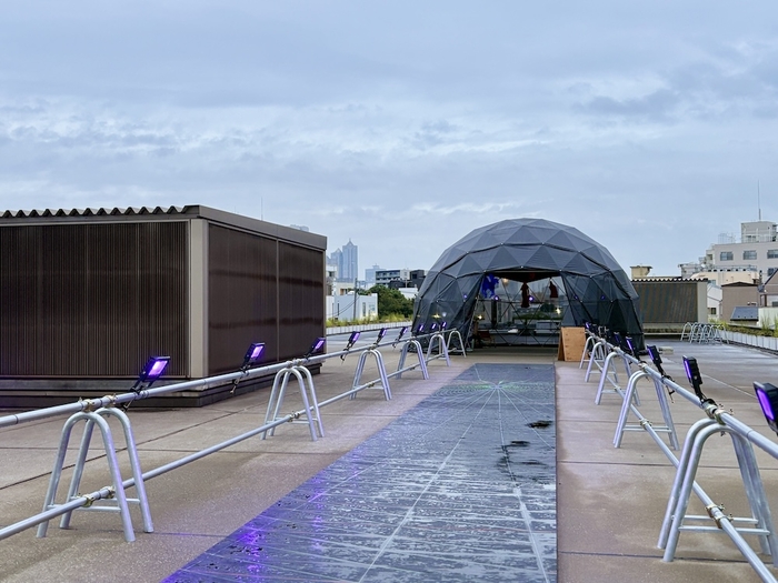 今回のイベントの有料チケットを持っている人だけのお楽しみで、会期中、通常なら入れない「東北沢」駅の屋上に上ることができる。そこで来場者を待っているのが、ビジュアル・アーティストの森貴之の作品《Uranometria》だ。天球状のドームに星座のモチーフが浮かぶ、小さなプラネタリウムのような作品である。ドーム内にはリラクシングなアウトドアチェアが設えてあり、作品を見上げながらくつろぐことも可能だ。