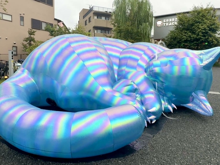 まずはカフェ「YOYO」のすぐ近くにある、巨大な青い猫のアートのもとへ。ネリー・ベン・ハユン=ステパニアンの《Schrödinger’s Cats》という作品だ。アルファベットだと分かりづらいが、「シュレディンガーの猫」である。青い猫たちが出てくるイマーシブシアターを見た後に青い猫のアートを鑑賞するというのもなかなか感慨深い。