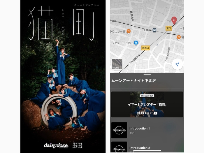 イマーシブシアターは、2000年代にロンドンで生まれた比較的新しいスタイルの演劇。観客が自ら移動したり、登場人物と関わったりしながら作品世界を“体験”していくもので、劇場から外へ飛び出したような芝居をイメージするといいかもしれない。今回の『ムーンアートナイト下北沢』では、クリエイティブユニットdaisydozeによる音声+ダンスのイマーシブシアター作品「猫町」を楽しむことができる。