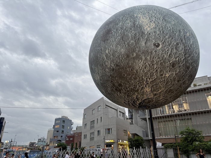 「下北沢」と「東北沢」の間には、『ムーンアートナイト下北沢』のシンボル的作品の《Museum of the Moon》が浮かんでいる。縮尺およそ50万分の1、直径7メートルのリアルな月だ。日没後は発光する仕様なのだが、17時半の時点ではまだ周囲が明るかったためあまり輝きを実感できず。その代わり、NASAが撮影したという高精細な月面画像のプリントはたっぷり味わうことができた。