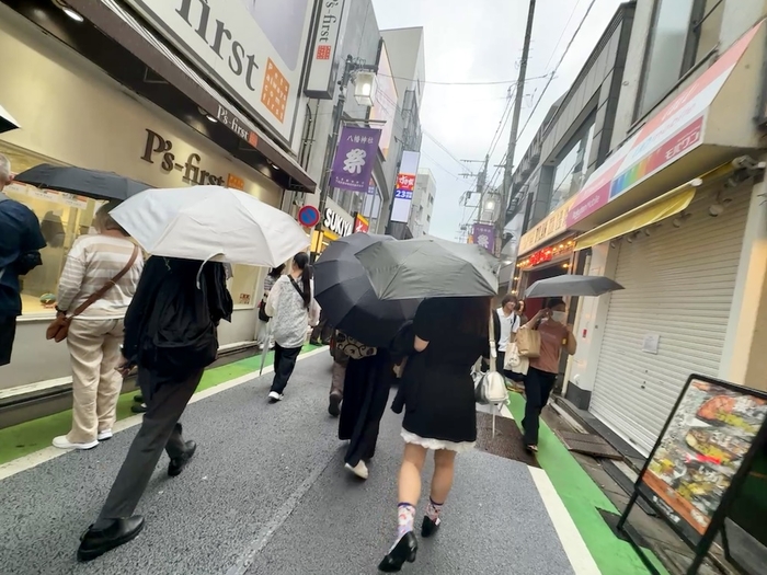 別のイベントで盛り上がっているところも果敢に通っていく。詩人は「少し身を屈めて歩こう」とか、普通だったらしないような、時にはもっと無茶な指示を与えてくる。他の体験者たちと「えぇ……ホントにやるの?」と戸惑いながらやってみるのも、またニヤニヤが止まらないポイントだ。なお身を屈めて人混みを通り抜けるのは、自分が街の営みと完全に切り離され、別のレイヤーに移った感じがしてとても面白かった。どうせやるなら思いっ切りが肝心である。