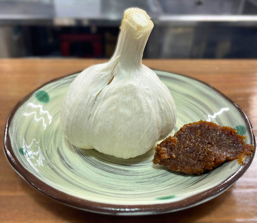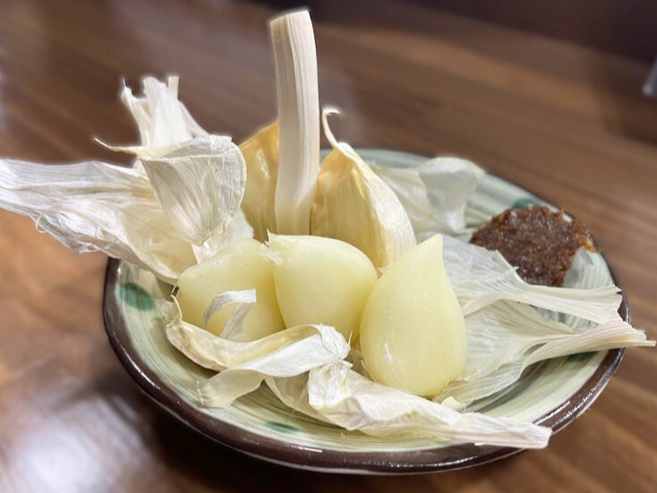 ニンニクの味わいを楽しめるシンプルな一品。ひと粒ひと粒が大きく、しっかりと身が詰まっており、心地よいホクホクとした食感。深いコクと自然な甘さが引き立ちます。ニンニクにつける味噌は、数種類の野菜と一緒に煮詰めた自家製。ビールやハイボールなどお酒の肴にぴったりです。