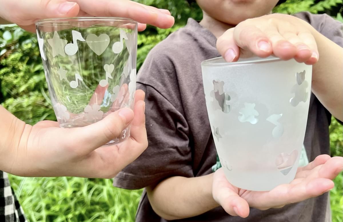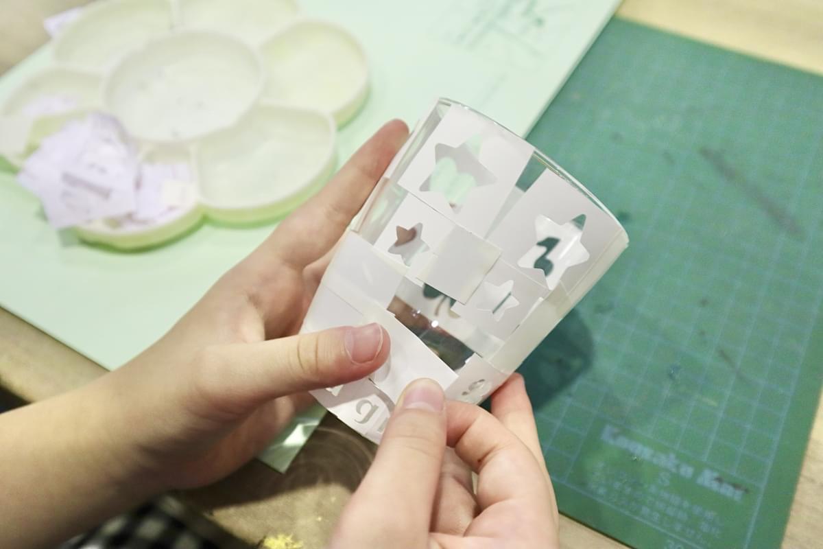 今回、ママスタ編集部の親子が体験したのは、「サンドブラスト」というガラス工芸。 透明のグラスに、自分で選んだ動物やハート、花に星、数字やアルファベットのシールを自由に貼っていきます。子どもたちは「どうしようかな〜」、「ここにハート貼ろうかな」と真剣な面持ち。