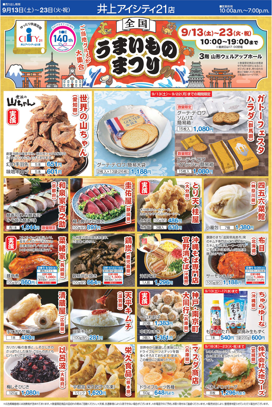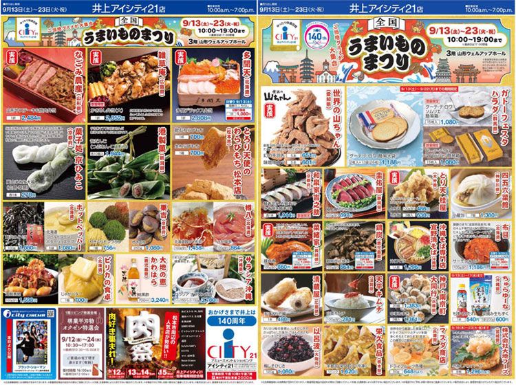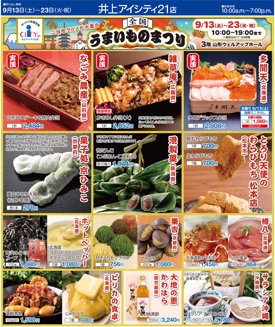 9/13(土)~9/23(祝)『全国うまいものまつり』かきめし・山形牛・手羽先・鯖寿司・栗モンブランなどご当地グルメが「井上アイシティ21」に大集合@長野県 山形村