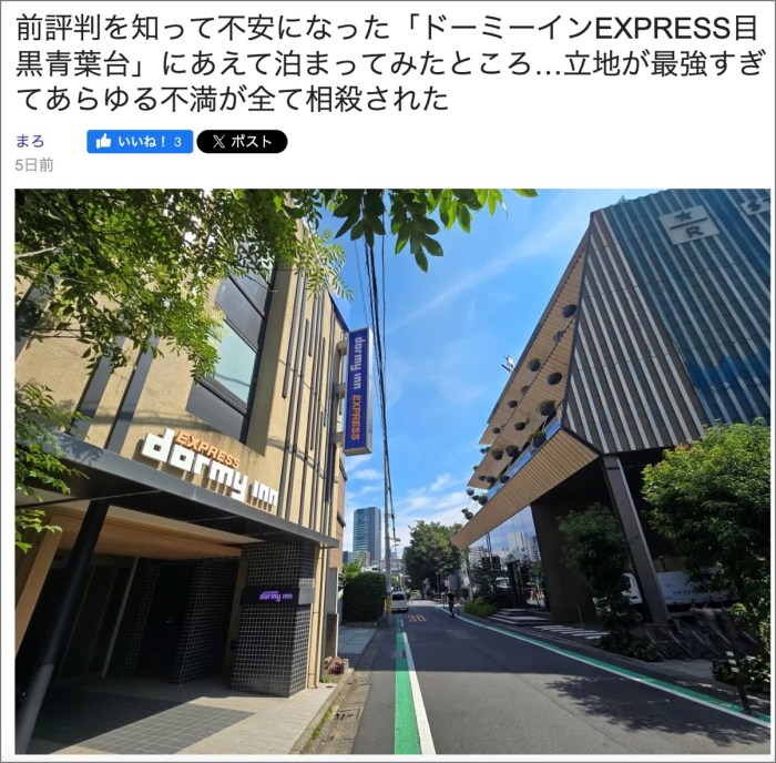 ・その19「前評判を知って不安になった「ドーミーインEXPRESS目黒青葉台」にあえて泊まってみたところ…立地が最強すぎてあらゆる不満が全て相殺された」