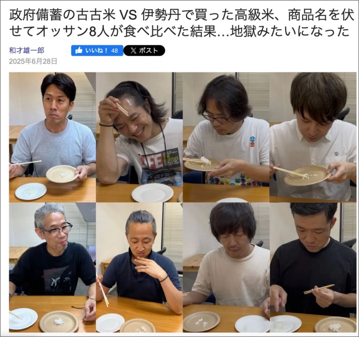 ・その10「政府備蓄の古古米 VS 伊勢丹で買った高級米、商品名を伏せてオッサン8人が食べ比べた結果…地獄みたいになった」