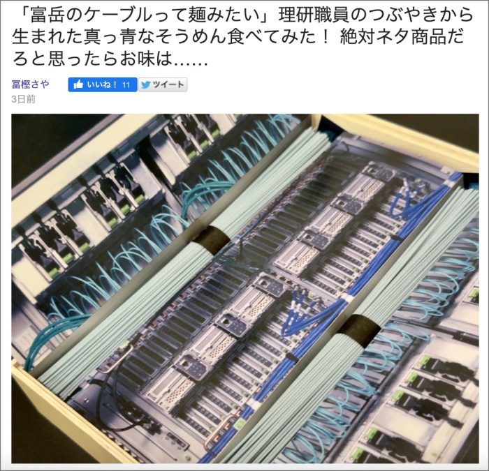 ・その15「「富岳のケーブルって麺みたい」理研職員のつぶやきから生まれた真っ青なそうめん食べてみた! 絶対ネタ商品だろと思ったらお味は……」