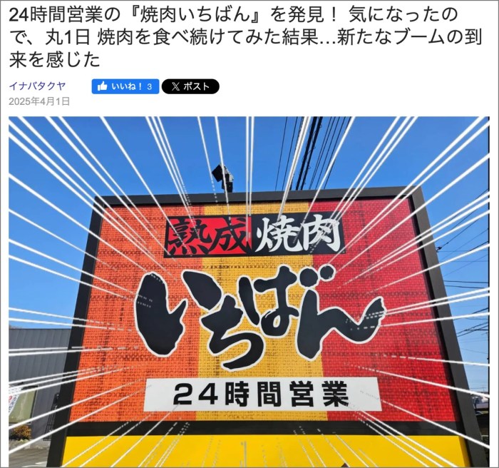 ・その22「24時間営業の『焼肉いちばん』を発見! 気になったので、丸1日 焼肉を食べ続けてみた結果…新たなブームの到来を感じた」
