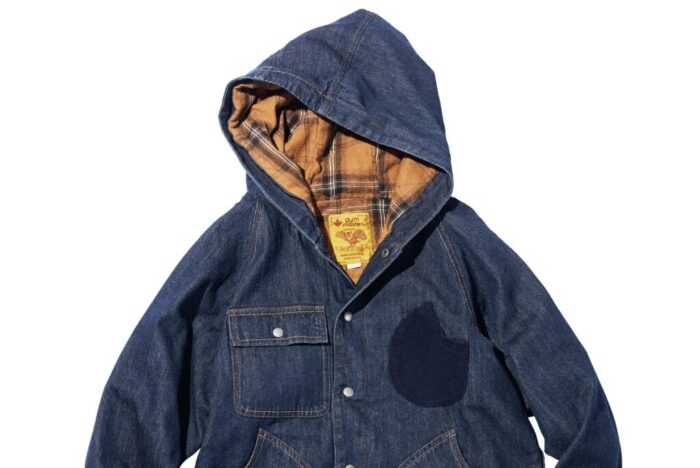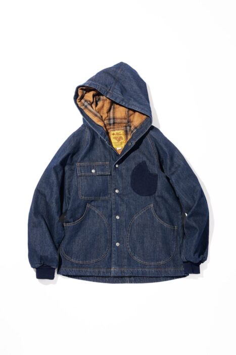 コットン100%デニムの表地に中綿を仕込んだ、秋冬仕様のデニムフードジャケット。ヴィンテージスウェットを彷彿とさせるボクシンググローブ型ポケットやリブ素材のポケット、裏地のクラシックなチェック柄がアクセントとなる。ワンウォッシュ仕様も展開。価格は1万4080円(グランド・ワンTEL03-3358-1652)