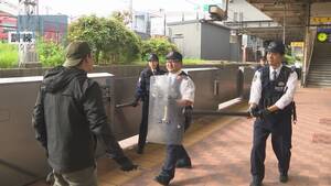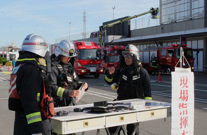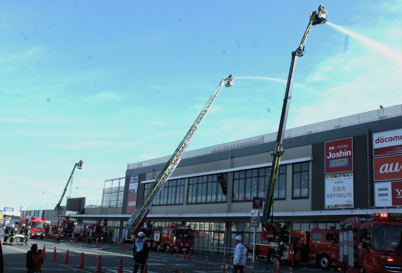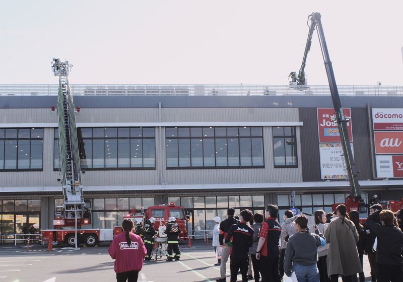 店舗西側の駐車場を訓練会場に、屋上に取り残された客を救助する訓練では、災害用ドローンで逃げ遅れた人の状況を把握しながら、3台のはしご車が屋上に消防隊員を運び、救出にあたった。買い物客や近隣の人たちも駐車場で訓練の様子を見守った。