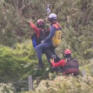 秋の全国火災予防運動を前に、三重県四日市市の大型ショッピングセンター、イオンタウン四日市泊で10月29日、特別消防訓練が行われた。店の従業員らの初期消火や避難訓練のほか、市消防本部のはしご車も複数台使い、屋上に取り残された人の救助や一斉放水などが繰り広げられた。