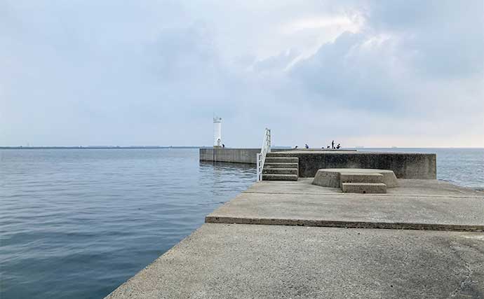 すだれ越しの光は淡く揺れる8月25日。キスを求めて三重県四日市市の磯津漁港堤防に釣行した。こちらは吉崎海岸の最北端に位置する堤防。全長100m、沖合に向かって設置されている。北側は船の航路なので南側を攻略してみた。