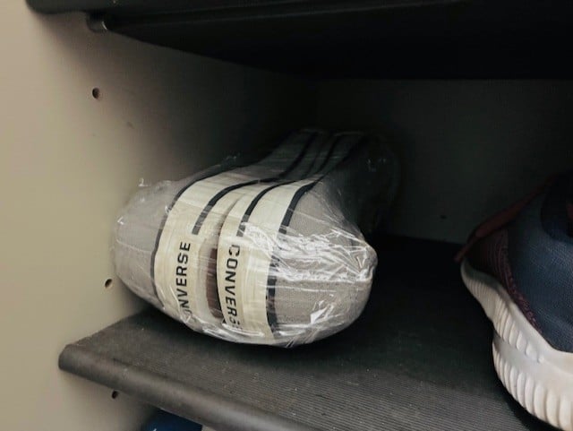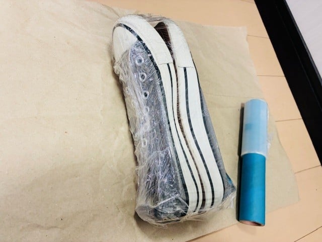 洗ったあとしばらく履いていなかったスニーカーにも、フィルムを巻いてみました。