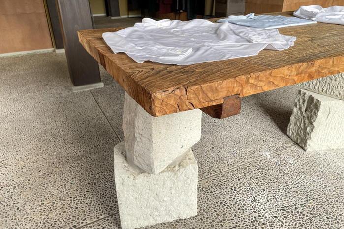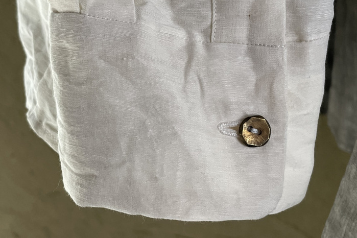 こちらの白いシャツのボタンは、一つひとつ削り出して手作りしたもの。