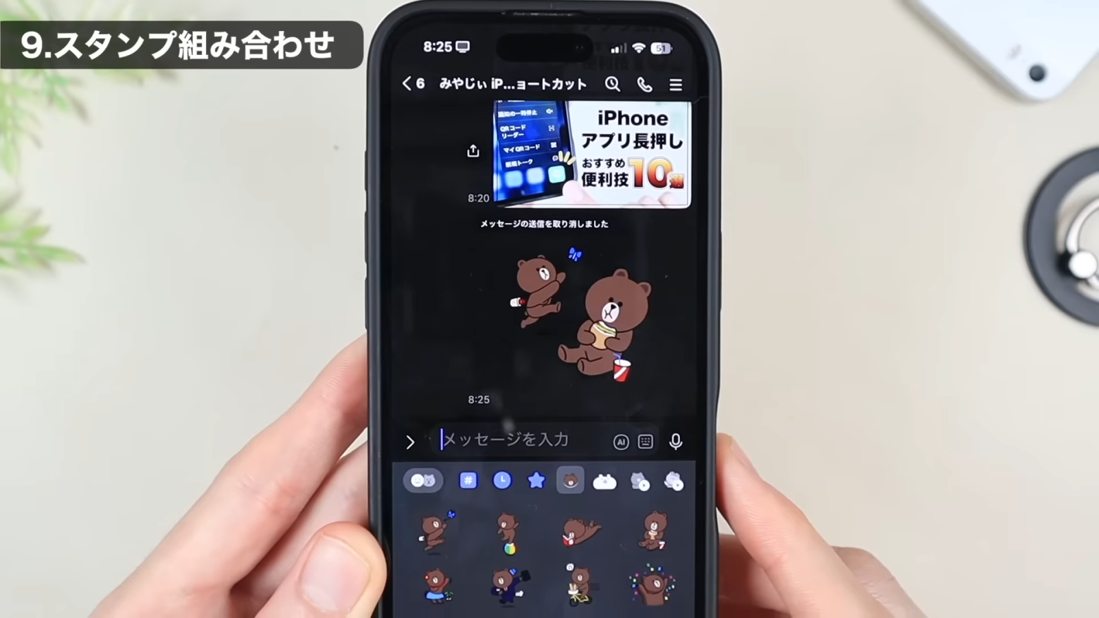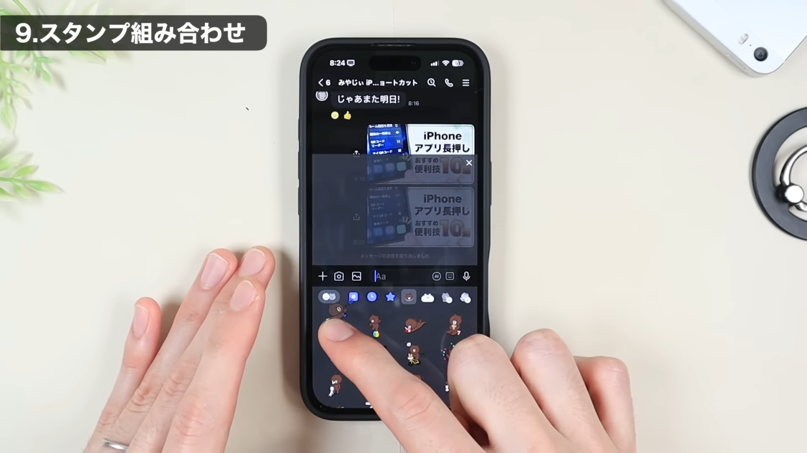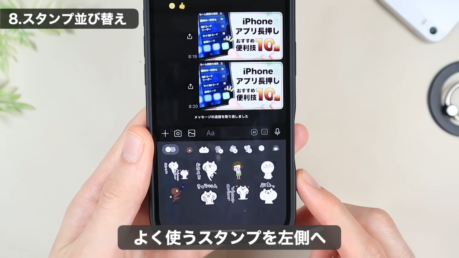 スタンプ画面を開きます。使いたいスタンプを、タップではなく長押しすると、