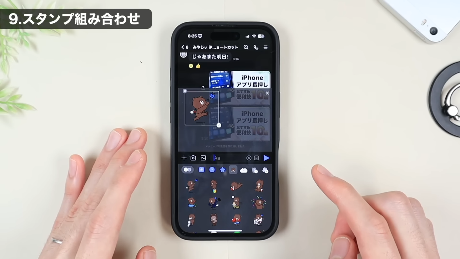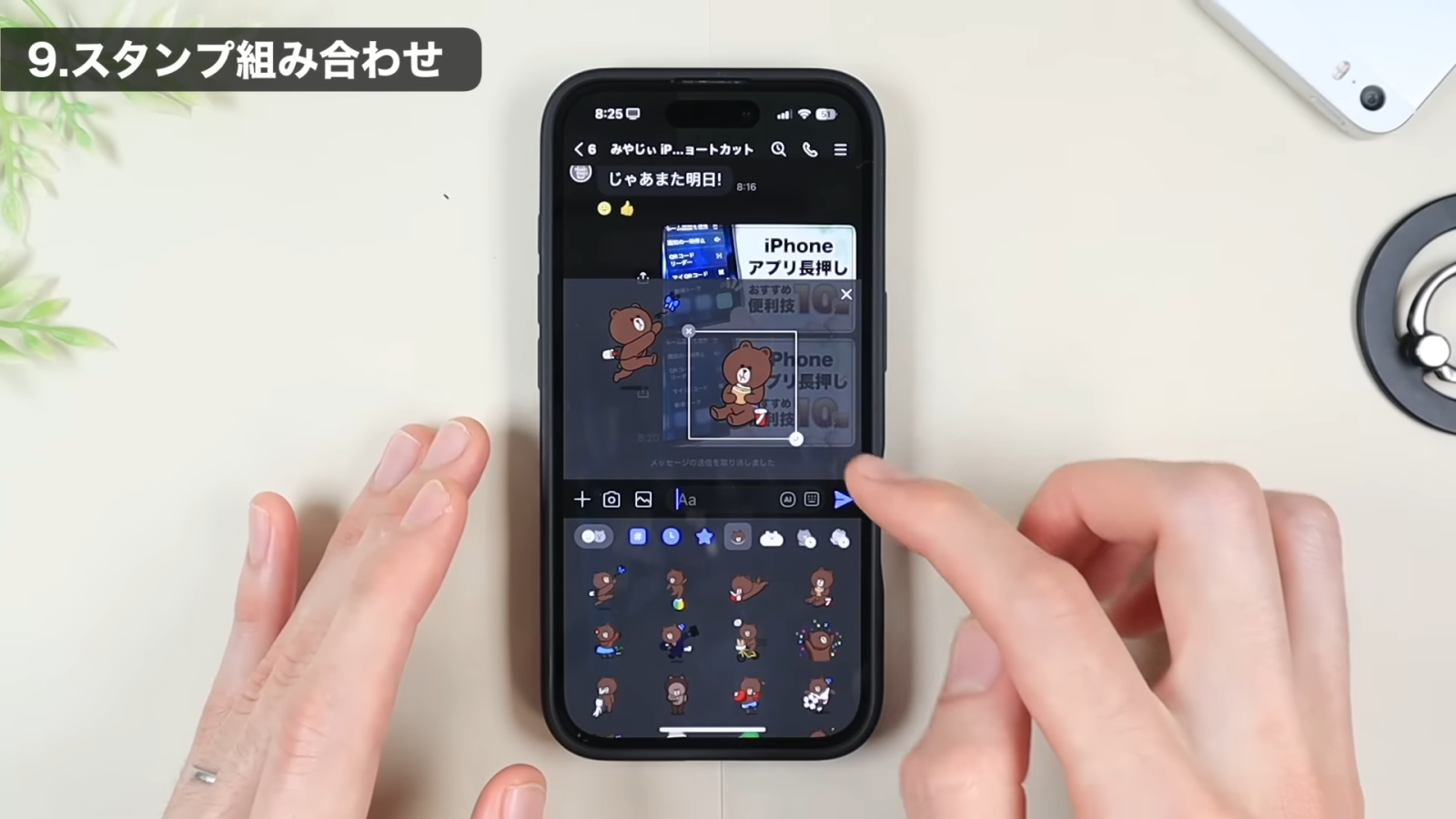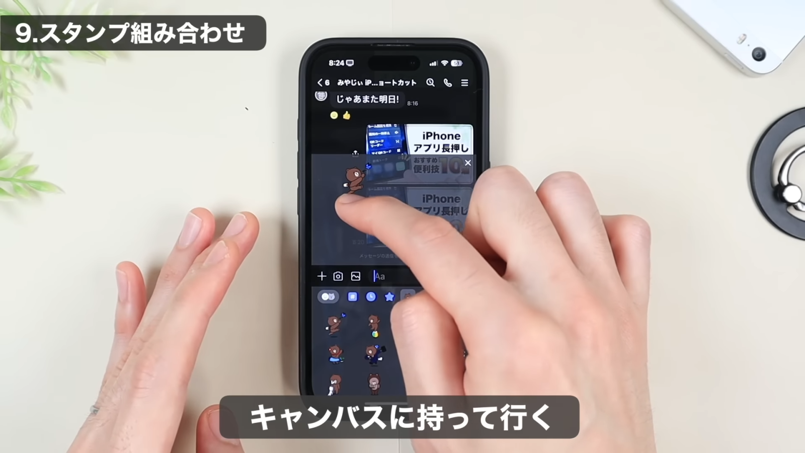 次に、組み合わせたい別のスタンプも同じように長押ししてスライドし、枠の中に配置します。