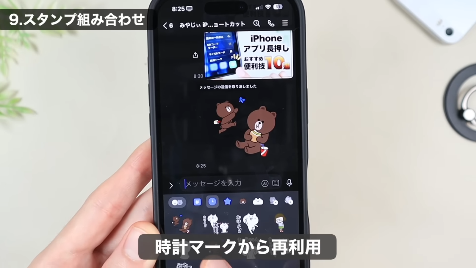 一度組み合わせたスタンプは、「最近使ったスタンプ」(時計マーク)から再利用できますよ。