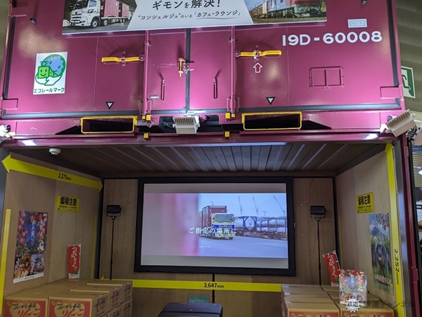 JR貨物は看板代わりに、もっともポピュラーな5トンコンテナ(19Dタイプ)を2段重ねでビッグサイトのホールに持ち込んだ。扉を開けた下段のコンテナでデモンストレーションしたのは、間もなく旬の季節を迎える青森産のリンゴだ。