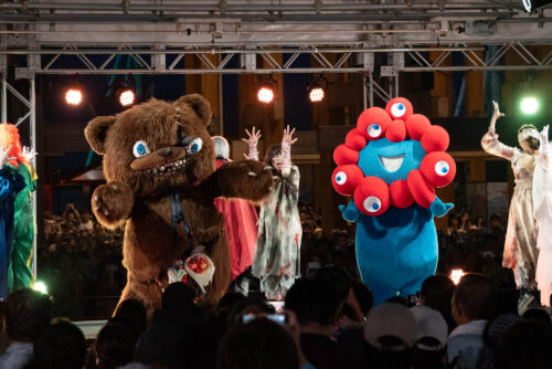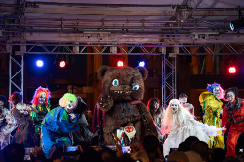 ハミクマが万博会場に現れました。ゾンビも登場し、一気にハロウィーン・ホラー・ナイトの世界が広がります。