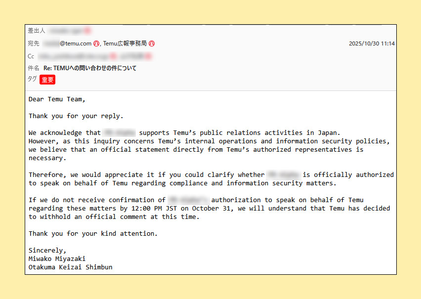 「もし10月31日昼12時(日本時間)までに権限の確認が得られない場合は、Temuとして本件に関する公式コメントを現時点では控えるご判断をされたものと理解いたします」。