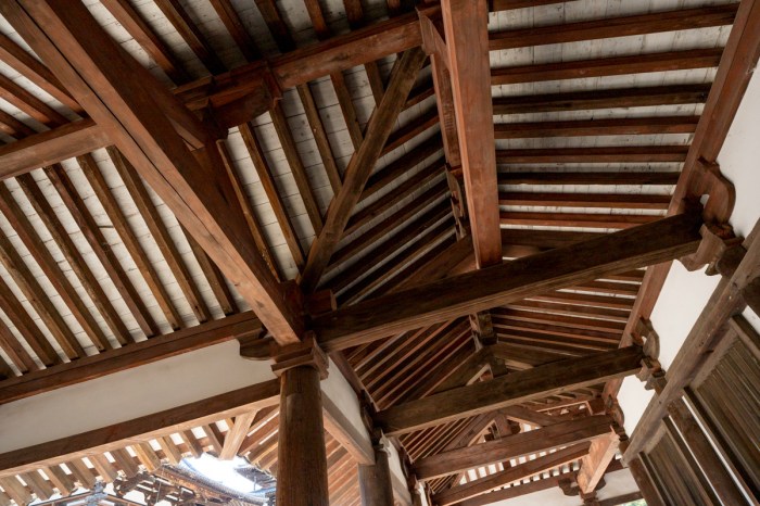 まあ視覚的な効果に限っても、飛鳥時代の弧を描く細い虹梁は頭上が広く感じられて解放感があるのに対し、平安時代のものは力強さを感じさせ、それぞれに異なる趣がある。